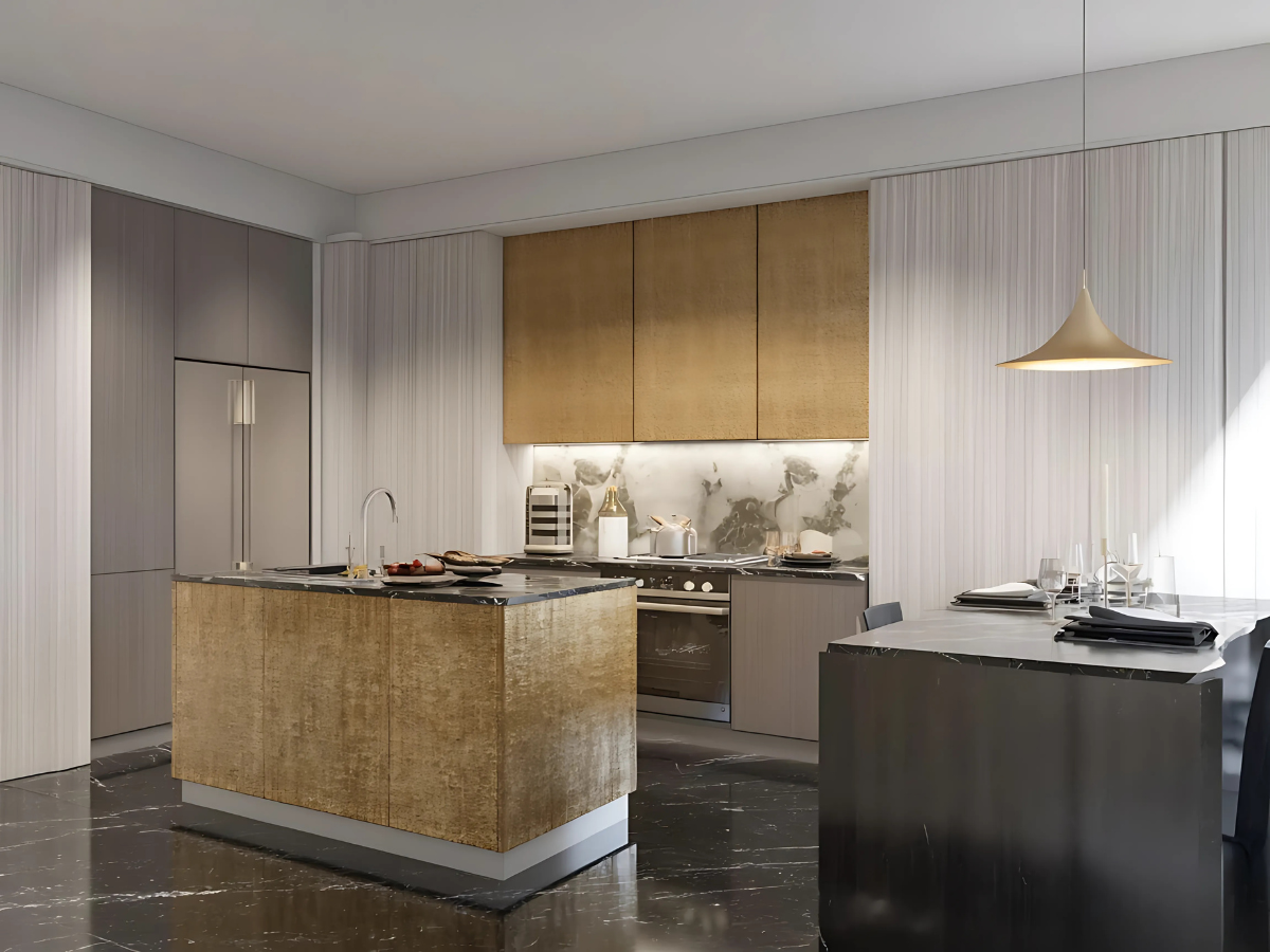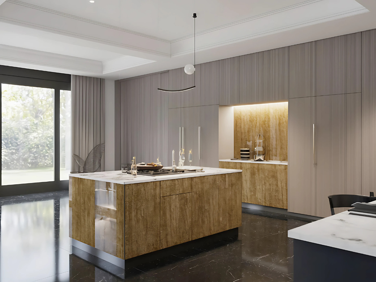 The Golden Essence Modern Kitchen radiates warmth with golden-toned vertical cabinetry paired with veined marble countertops. A large central island provides generous prep space and doubles as a social centerpiece, illuminated by a sculptural pendant. Floor-to-ceiling cabinetry enhances storage and keeps the space uncluttered. Recessed lighting highlights the richness of the natural wood, while minimalist hardware and integrated appliances preserve a seamless look. Balancing practicality and luxury, this kitchen is both inviting and sophisticated.