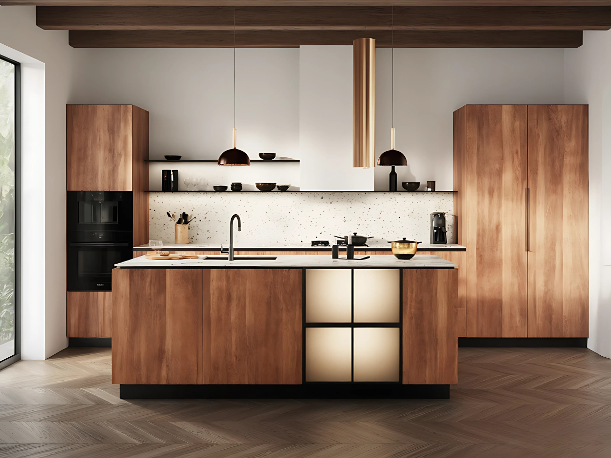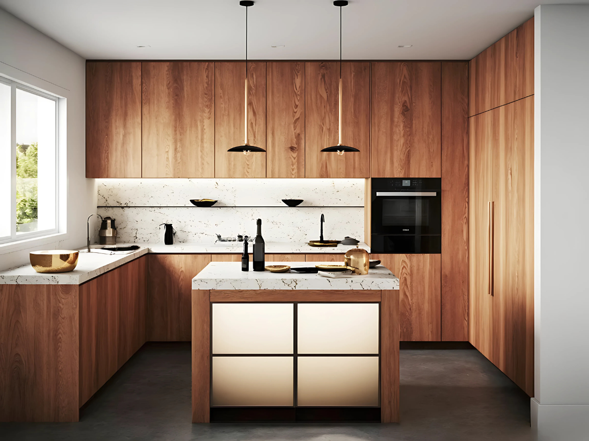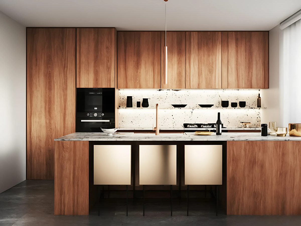 The Nordic Terra Chic Kitchen exudes natural warmth with sleek oak cabinetry and handleless finishes. A speckled marble backsplash and countertops add texture and refinement, complemented by subtle LED lighting under shelves for atmosphere. The island provides both seating and workspace, while integrated ovens and a gas cooktop ensure practicality. Pendant lighting enhances the dining zone with a cozy glow. This kitchen balances Scandinavian simplicity with modern sophistication, creating a functional and inviting space for daily living.