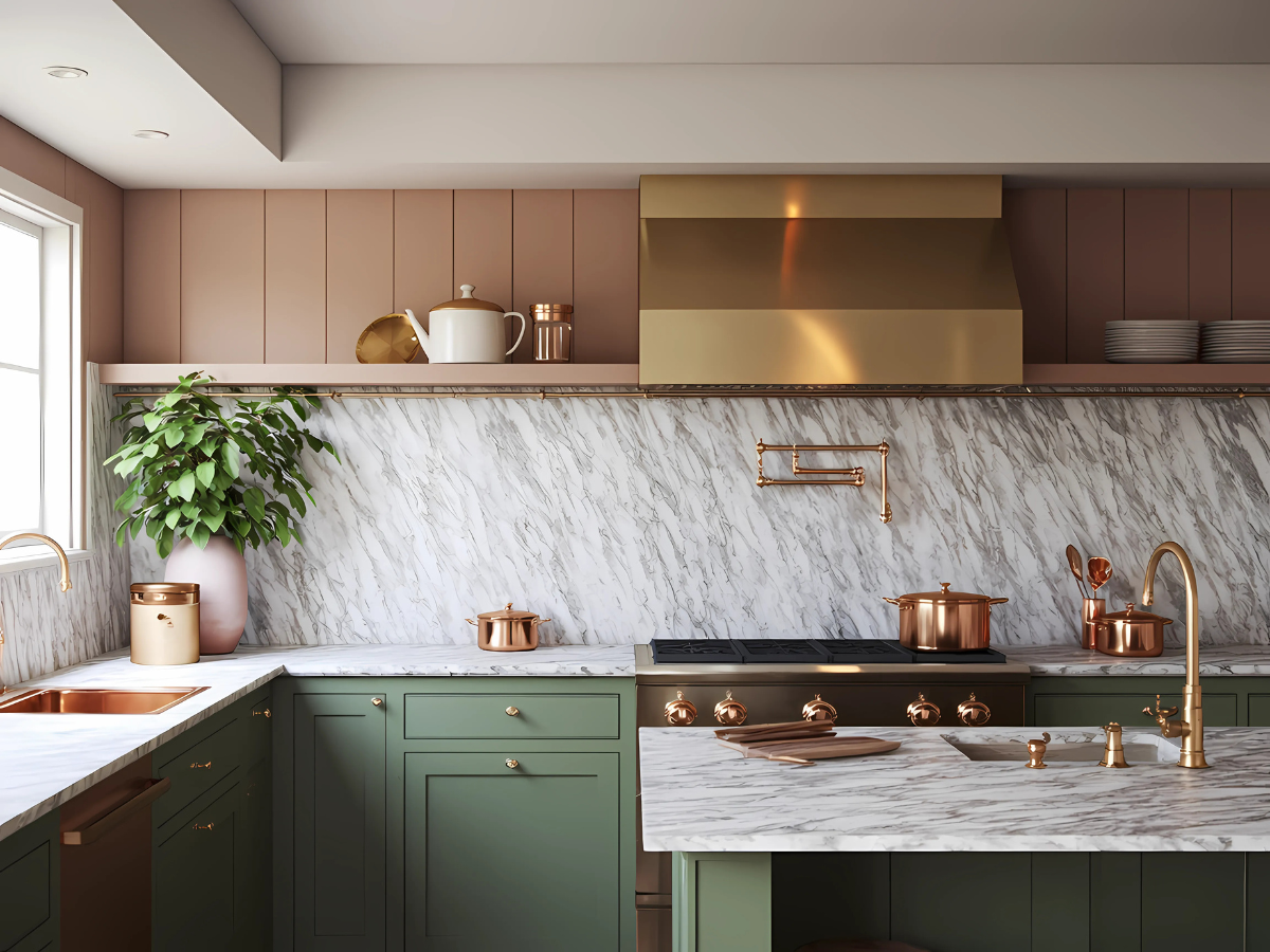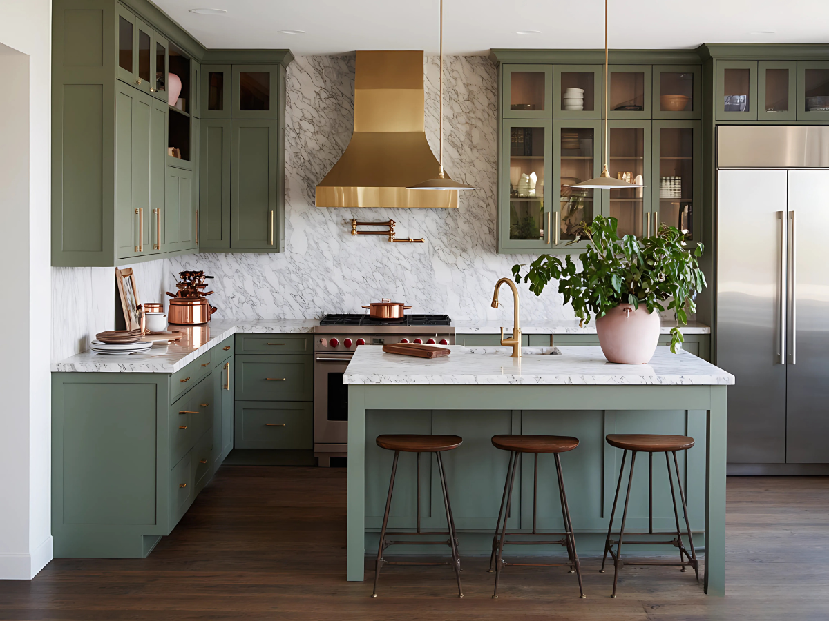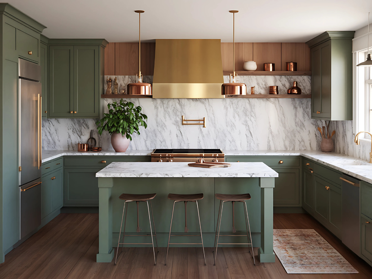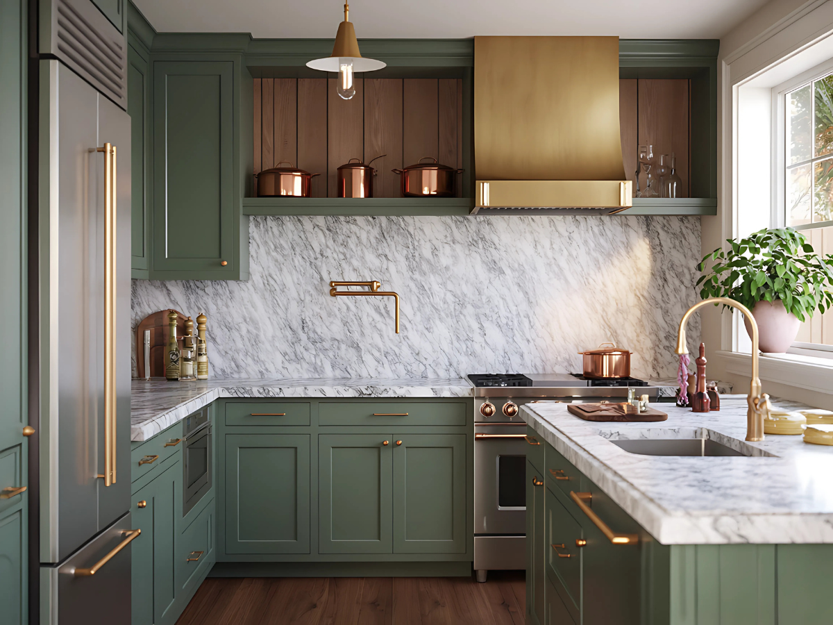 🔹 Materials: Marble, sage cabinetry, gold, wood flooring